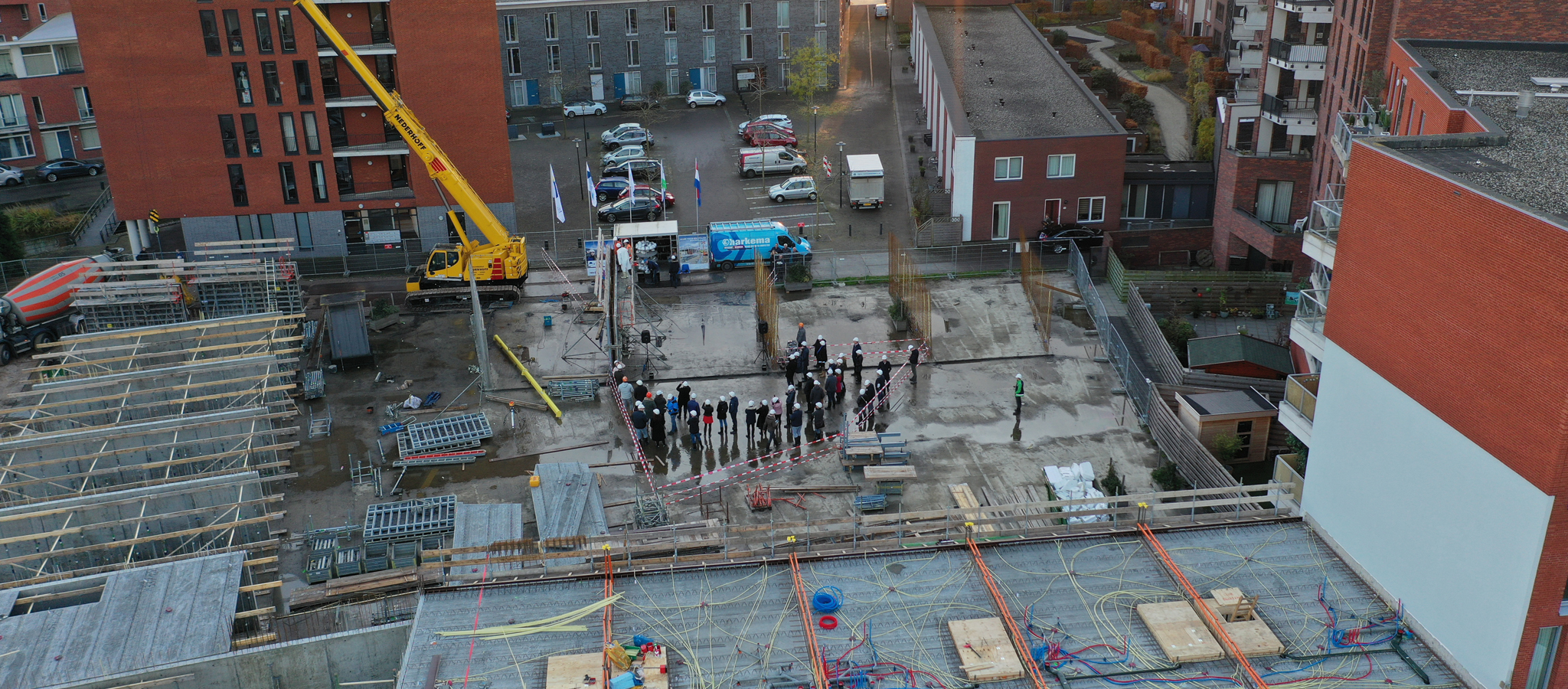 Goed nieuws voor de kopers van een woning in Merwehoofd fase 8. Vorige week is aannemer Burgland gestart met de bouwwerkzaamheden. Uiteraard ontvingen wij hier foto's van. Doordat de parkeergarage onder de woningen al aanwezig is kun je goed op de luchtfoto's zien waar de woningen komen.